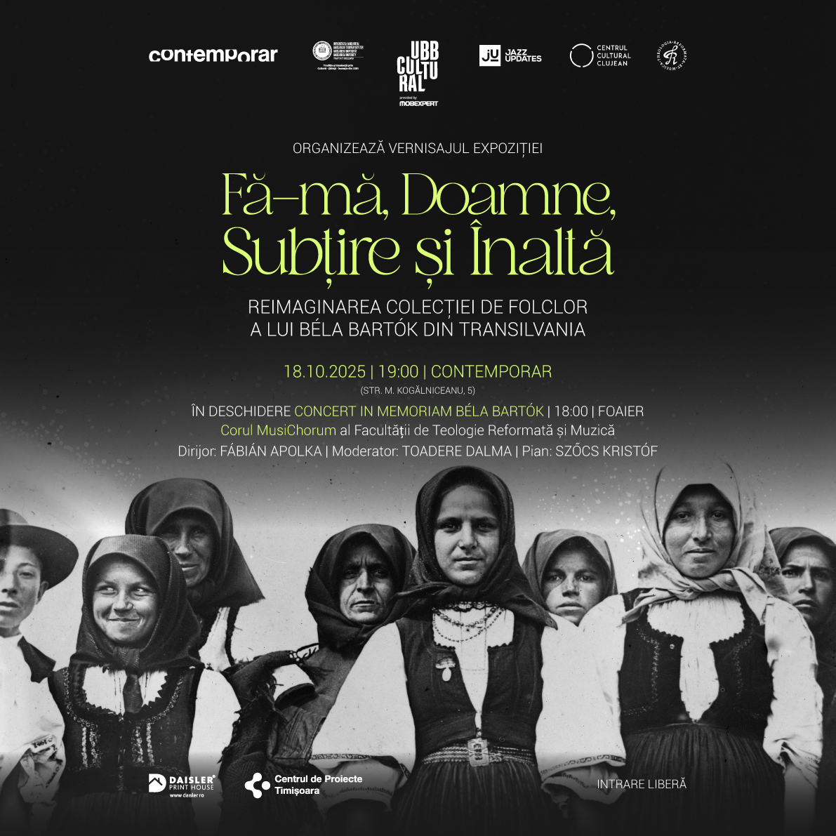 Sâmbătă, 18 octombrie, începând cu ora 19.00, în spațiul Contemporar din clădirea Colegiului Academic, va avea loc vernisajul expoziției „Fă-mă, Doamne, Subțire și Înaltă. Reimaginarea colecției de folclor a lui Béla Bartók din Transilvania”.