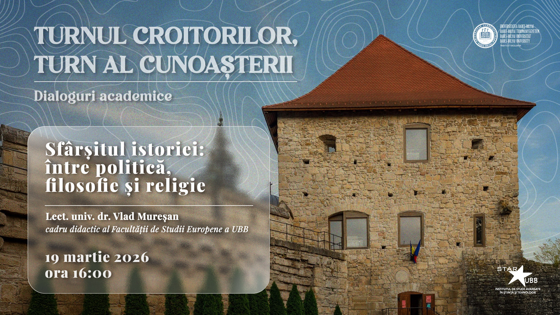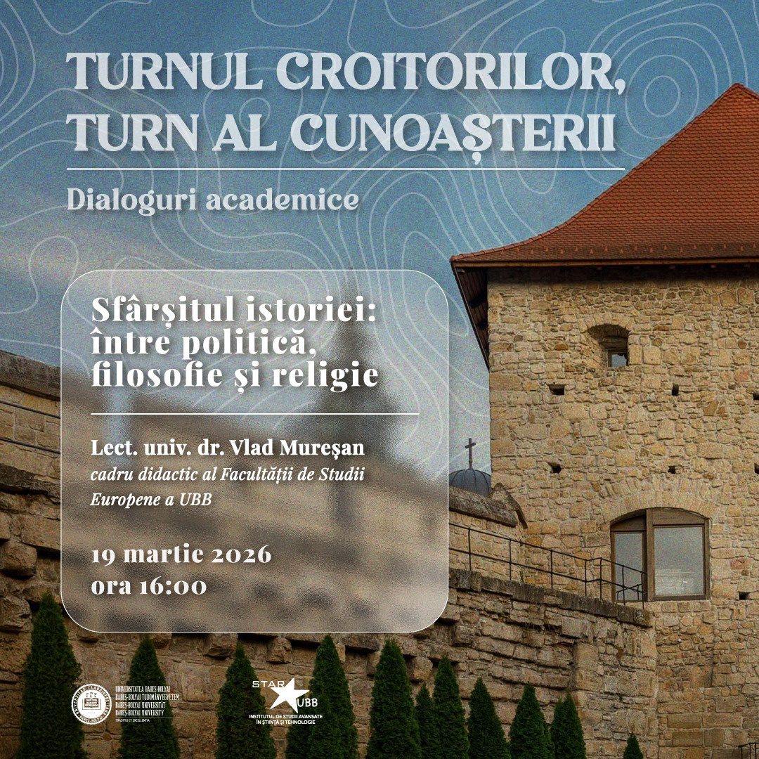 Institutul STAR-UBB al Universității Babeș-Bolyai din Cluj-Napoca (UBB) va continua joi, 19 martie 2026, de la ora 16:00, seria de cursuri și prelegeri „Studium Generale”, găzduită de Turnul Croitorilor, cu o prelegere intitulată „Sfârșitul istoriei: între politică, filosofie și religie”, susținută de dr. Vlad Mureșan, lector al Facultății de Studii Europene a UBB.