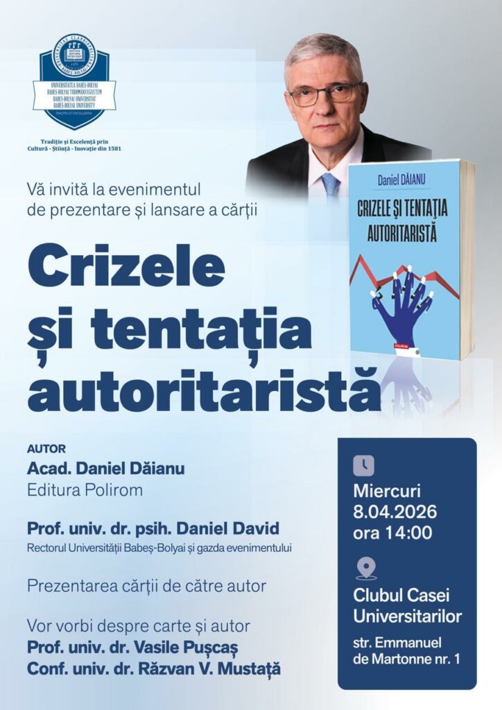 Universitatea Babeș-Bolyai din Cluj-Napoca (UBB) va găzdui miercuri, 8 aprilie 2026, lansarea volumului cu titlul „Crizele și tentația autoritaristă”, al cărui autor este președintele Consiliului Fiscal al României, Daniel Dăianu.