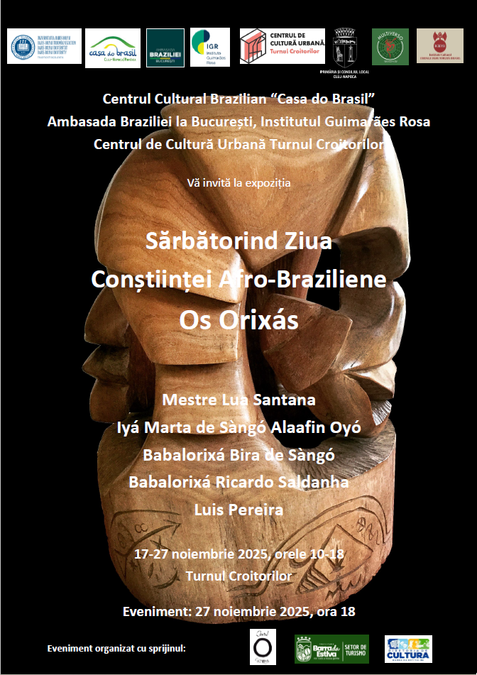 Centrul Cultural Brazilian al Universității Babeș-Bolyai din Cluj-Napoca (UBB) – Casa do Brasil, împreună cu Ambasada Braziliei la București, Institutul Guimarães Rosa, Centrul de Cultură Urbană Turnul Croitorilor, Institutul Cultural Isedalé Egbé Yorubá Brasil și Mestre Lua Santana vă invită la expoziția „Sărbătorind Ziua Conștiintei Afro-braziliene – Os Orixás” și la evenimentul special de prezentare din data de 27 noiembrie, ora 18.00, cu participarea artistului Mestre Lua Santana.