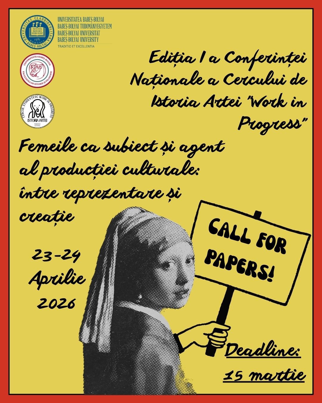 Studenții, masteranzii și doctoranzii interesați de studiile de gen, istoria artei și producția culturală sunt invitați să își prezinte cercetările în cadrul conferinței cu tema „Femeile ca subiect și agent al producției culturale: între reprezentare și creație”, prima conferință națională organizată de Cercul de Istoria Artei „Work in Progress” din cadrul Facultății de Istorie și Filosofie a Universității Babeș-Bolyai din Cluj-Napoca (UBB).