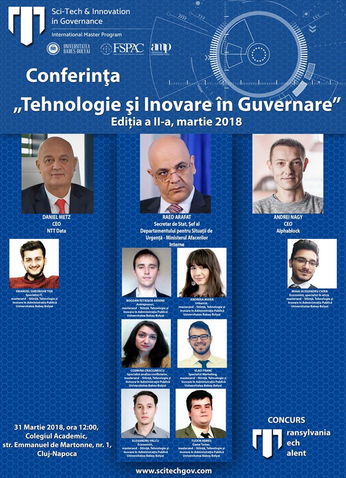 Die Fakultät für Politik-, Verwaltungs- und Kommunikationswissenschaften an der BBU, durch das internationale Masterprogramm „Science, Technology and Innovation in Public Governance”,  veranstaltet Samstag, am 31. März 2018, ab 12 Uhr, im Akademischen Kolleg (Emmanuel de Martonne-Str. Nr. 1) die zweite Ausgabe der Tagung “Technologie und Innovation in Governance”