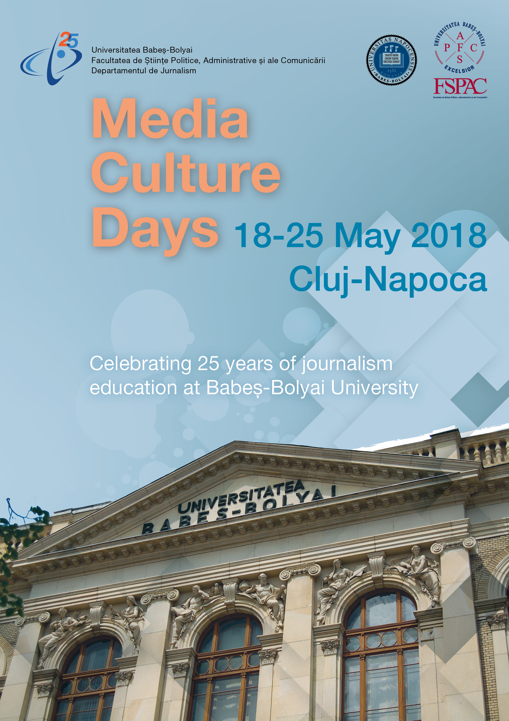 Das Department für Journalistik an der Fakultät für Politik-, Verwaltungs- und Kommunikationswissenschaften der UBB organisiert zwischen dem 18.-25. Mai 2018 eine Reihe von Veranstaltungen unter dem Titel “Tage der Medienkultur”- 25 Jahre Journalistik an der BBU Klausenburg, gewidmet den Fachkräften und den zukünftigen Journalist/innen, aber auch dem Publikum.