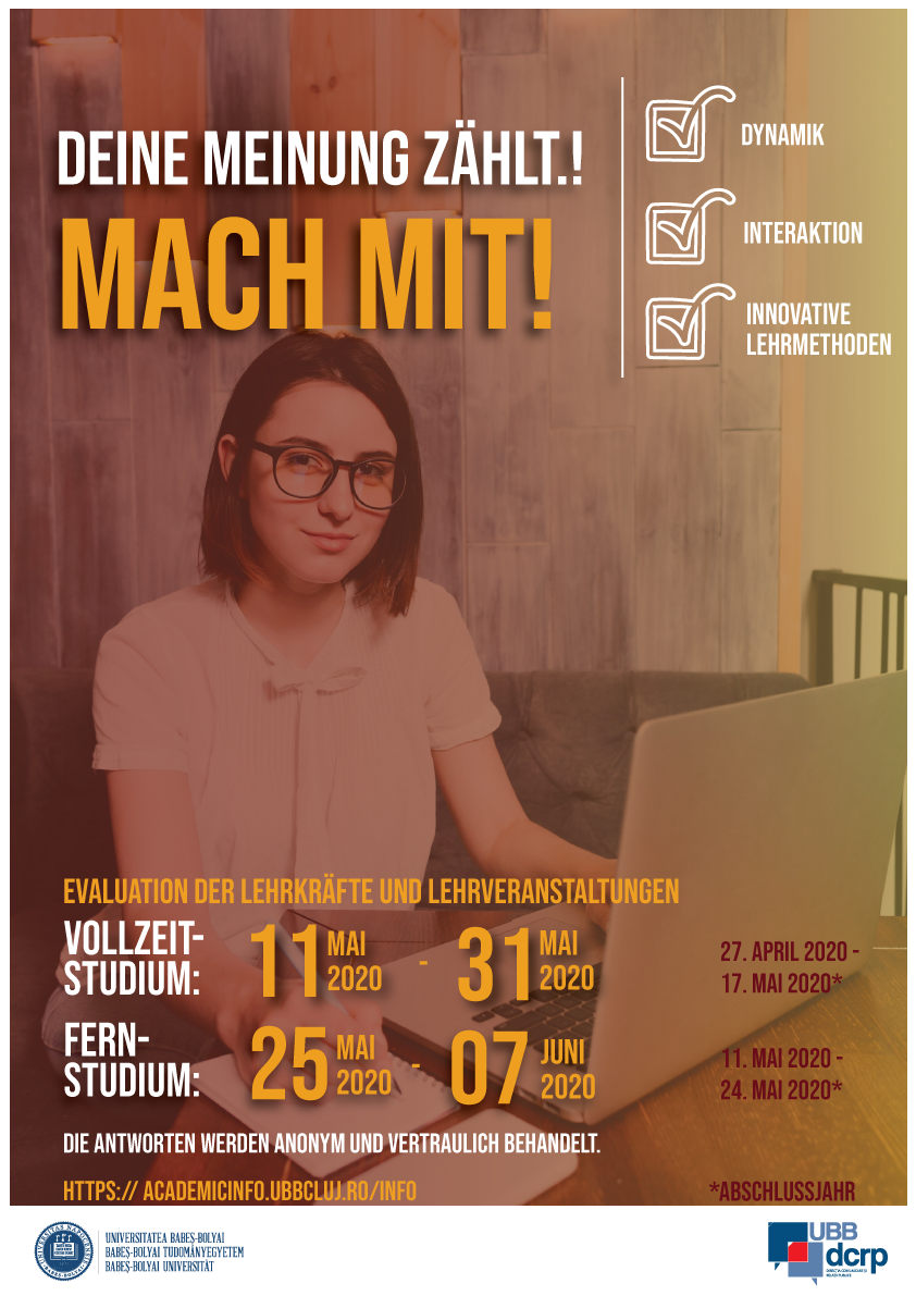 Studenten und Studentinnen der Babeș-Bolyai Universität erhalten, zwischen dem 27. April – 7. Juni 2020, die Möglichkeit die Lehrveranstaltungen zu evaluieren