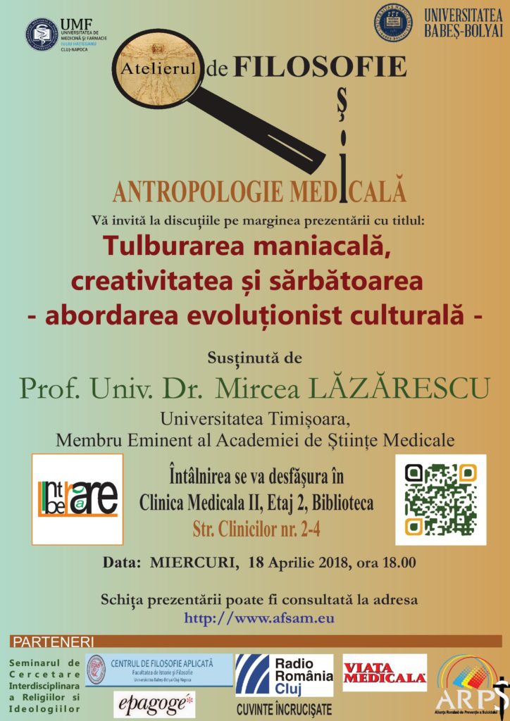 Die Babeș-Bolyai-Universität bietet, am 18. April, 18 Uhr, den Rahmen für einen Vortrag mit dem Titel “manische Störung, Kreativität und die Feier – kulturell-evolutionistische Ansätze”des Univ.-Prof. Dr. Mircea Lăzărescu von der Universität Temeswar, herausragendes Mitglied der Akademie der Medizinwissenschaften.