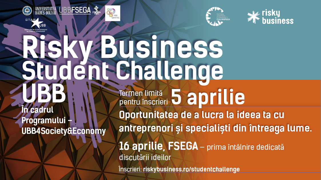 Risky Business Student Challenge UBB ist das erste Event des Projekts UBB4Society&Economy, entwickelt von der Stelle für Technologie- und Wissenstransfer-Management (OMTTC) der BBU, unter der Ägide des STAR-UBB-Instituts, und hat als Zweck die Förderung des Wissenstransfers in der Gesellschaft.