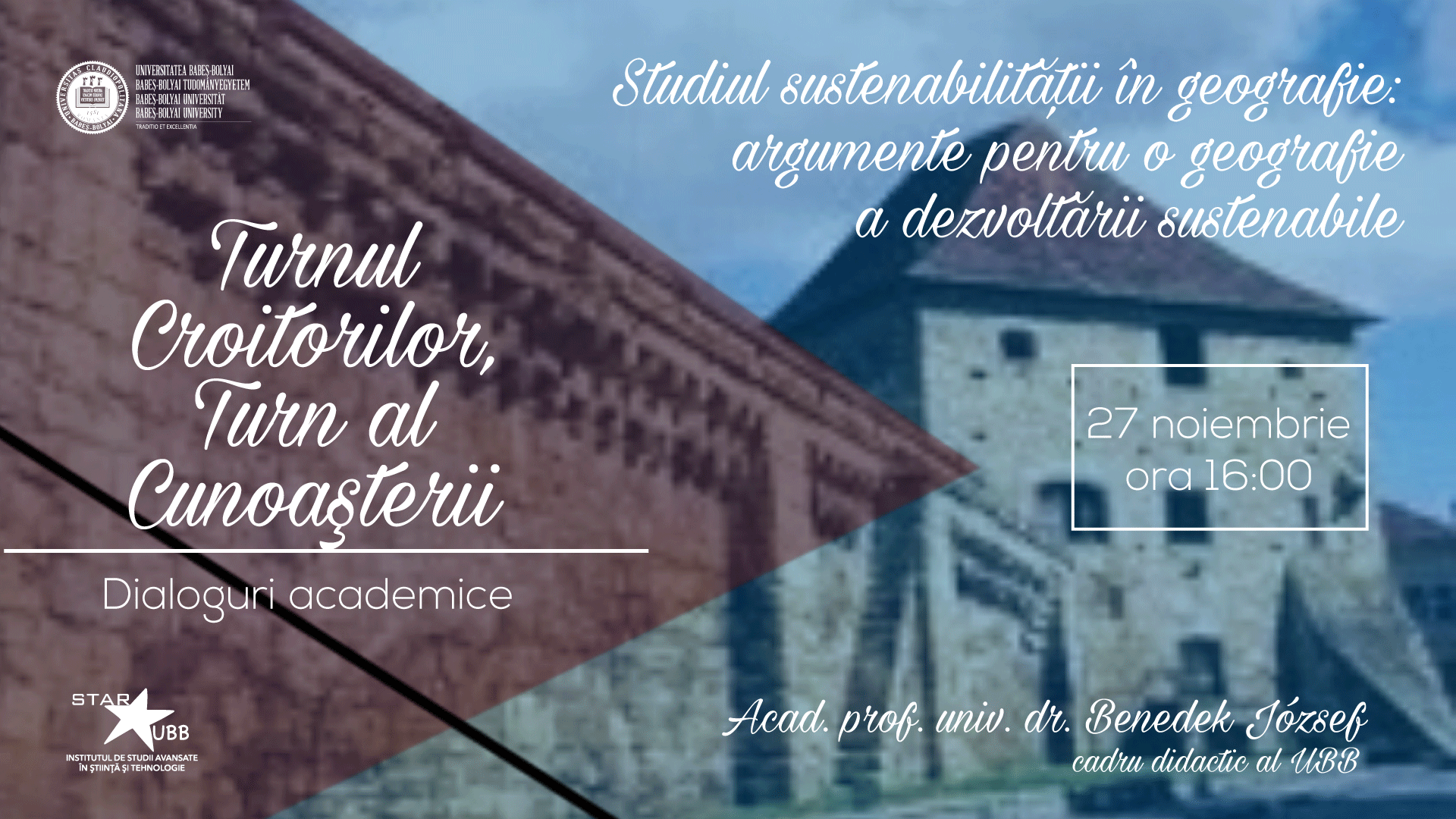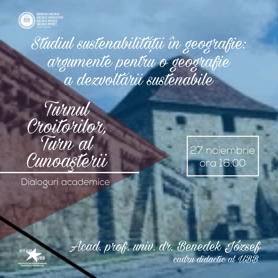 Institutul STAR-UBB al Universității Babeș-Bolyai din Cluj-Napoca va continua joi, 27 noiembrie 2025, de la ora 16:00, seria de cursuri și prelegeri „Studium Generale”, găzduită de Turnul Croitorilor, cu o prelegere intitulată „Studiul sustenabilității în geografie: argumente pentru o geografie a dezvoltării sustenabile”, susținută de acad. prof. univ. dr. Benedek József, profesor universitar al Facultății de Geografie a UBB.